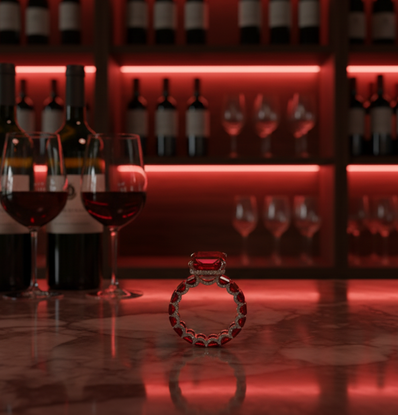 🍷 Radiant Centre piece: Features a fiery, emerald-cut ruby centre piece that commands attention and symbolises eternal love and strength.